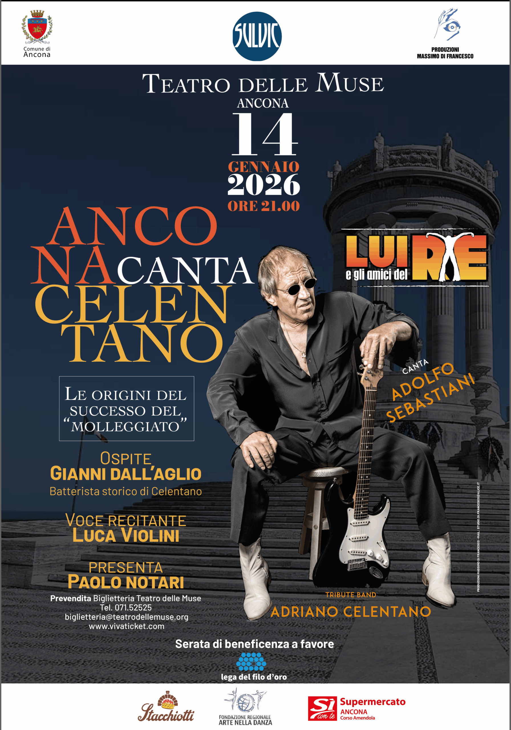 Il primo evento 2026 dell’ASSOCIAZIONE SULVIC 14 Gennaio 2026 alle ore ore 21 al Teatro delle Muse si celebra il mitico Adriano Celentano che proprio qui ad Ancona iniziò la sua carriera scoperto dagli impresari teatrali SULPIZI e VICO. Grazie all’Agenzia SULVIC LEGGI